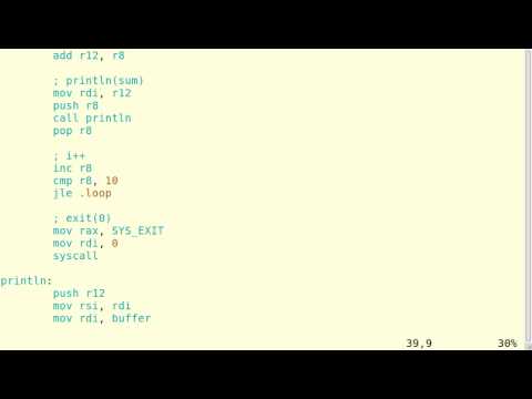 I'm going to demonstrate using collar saved registers and collie saved registers with function calls. So, I've already created put in some basics for this file. I have global start. I created a BSS segment segment with a very small buffer, just 20 bytes, should be fine. I have to find a few constants that we'll use for a newline character, system calls, and standard out. I've also copied the body of the eye to a function instance. We'll be using it and here we'll start in our main function and start. So, I'm going to choose two variables, two local variables, that I'm going to use. And for our demonstration program, we'll just print out. We'll write a program that takes the sum of all the numbers from zero through ten, and it as it's computing that total, taking the sum, it prints out the sum at each step. So, it'll print out zero, then it will print out zero plus one, and then it'll print out zero plus 1 plus 2, and so forth until we get all the numbers up through ten included. So, I'm going to use a couple variables. I'm going to choose r8 to represent my value of I. I chose r8 because it is a caller saved register, meaning that if I'm about to make a function call and I care about the value in r8, I'm responsible for saving that value first and before I make the function call. Any function that I call is permitted to destroy that value. And then, let's use r12, which would be my running total, my sum so far. And I'd put that in r12, which is a caller saved register, excuse me, a collie saved register, meaning that the I can call other function safely...